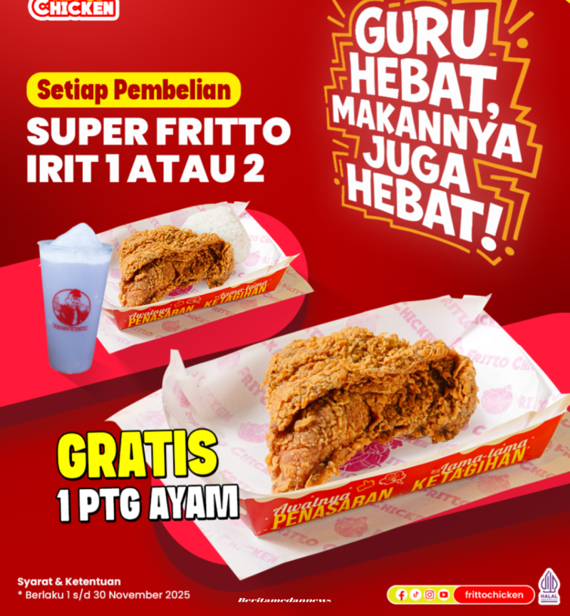 Selama 1–30 November 2025, para guru di Kota Medan dan sekitarnya bisa menikmati gratis 1 potong ayam setiap pembelian Super Fritto Irit 1 atau 2. Cukup tunjukkan kartu identitas guru ke kasir di gerai Fritto Chicken yang berpartisipasi.